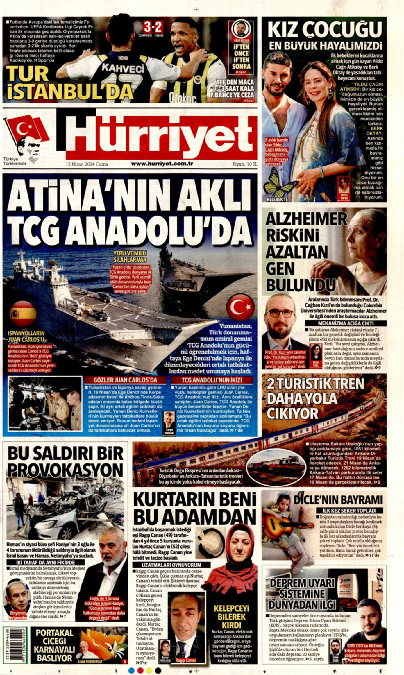 Η «Hurriyet» σχολιάζει ότι «η Αθήνα έχει συνέχεια στον νου της το αεροπλανοφόρο Anadolu» με αφορμή την άσκηση που θα πραγματοποιηθεί στο Αιγαίο με τη ναυαρχίδα του ισπανικού στόλου, το πλοίο αμφίβιων επιχειρήσεων «Χουάν Κάρλος», δίδυμο πλοίο του τουρκικού μίνι αεροπλανοφόρου «Anadolu».