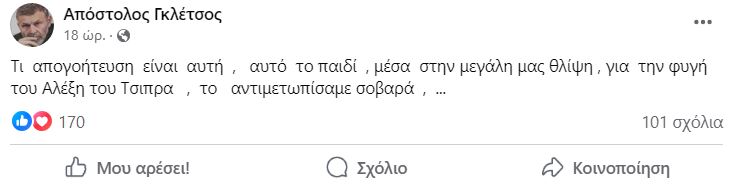 Πιο συγκεκριμένα, ο Απόστολος Γκλέτσος έγραψε: «Τι απογοήτευση είναι αυτή, αυτό το παιδί, μέσα στη μεγάλη μας θλίψη, για τη φυγή του Αλέξη του Τσιπρα, το αντιμετωπίσαμε σοβαρά…».