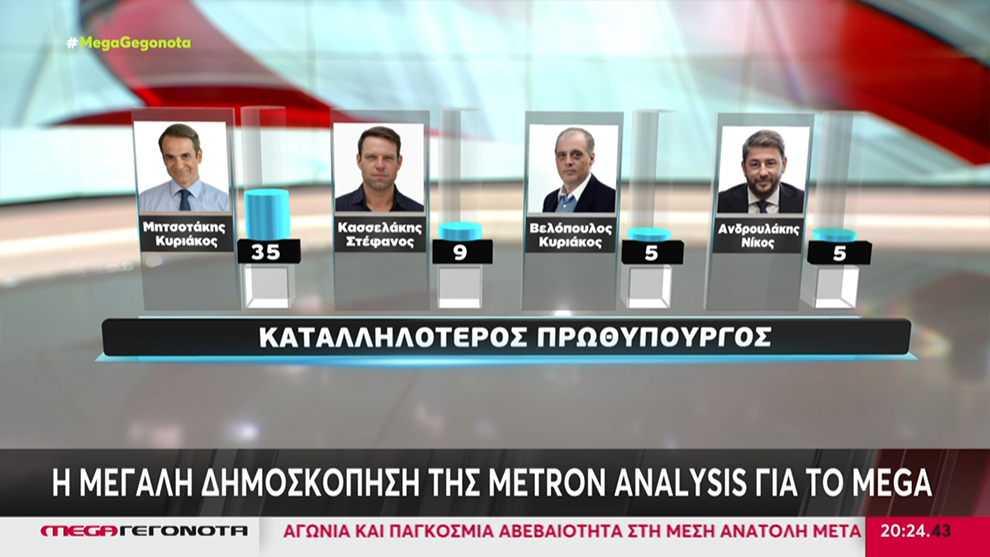Αντίστοιχα στην καταλληλότητα για πρωθυπουργό ο Κυριάκος Μητσοτάκης καταγράφει 35%. Ακολουθεί ο Στέφανος Κασσελάκης με 9%, ο Κυριάκος Βελόπουλος με 5%, ο Νίκος Ανδρουλάκης με 5%, ο Δημήτρης Κουτσούμπας με 4%, η Ζωή Κωνσταντοπούλου με 2% και ο Δημήτρης Νατσιός με 1%.