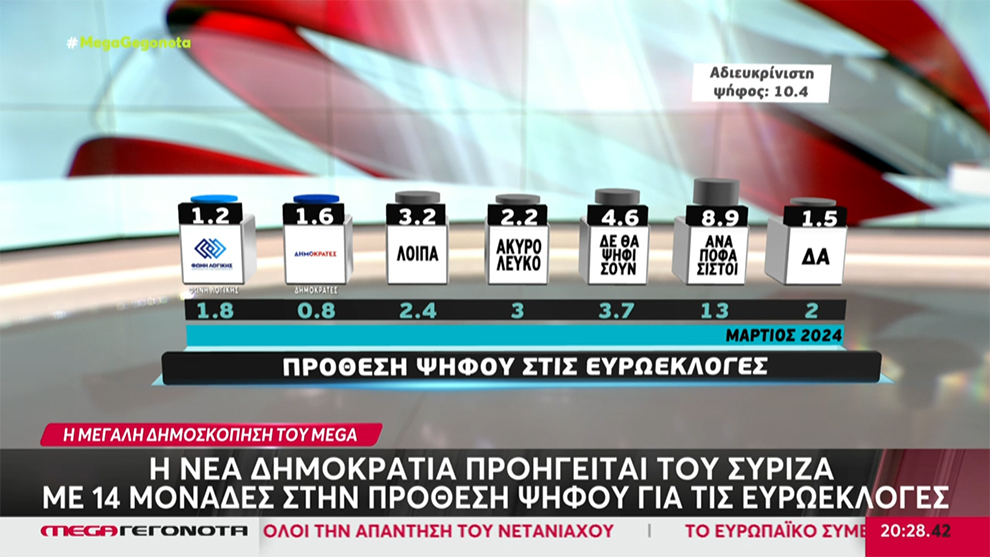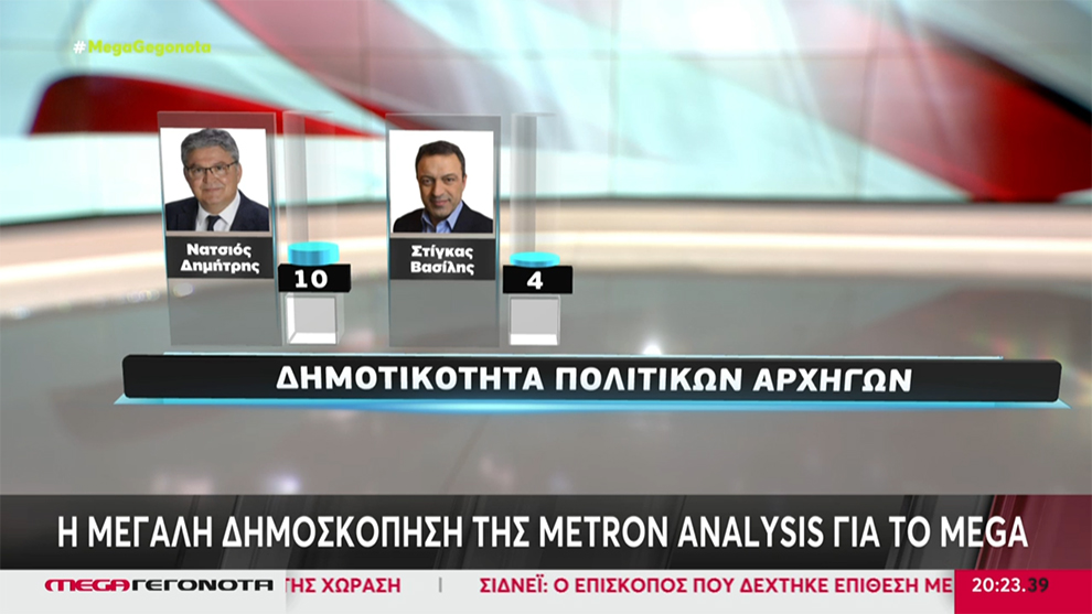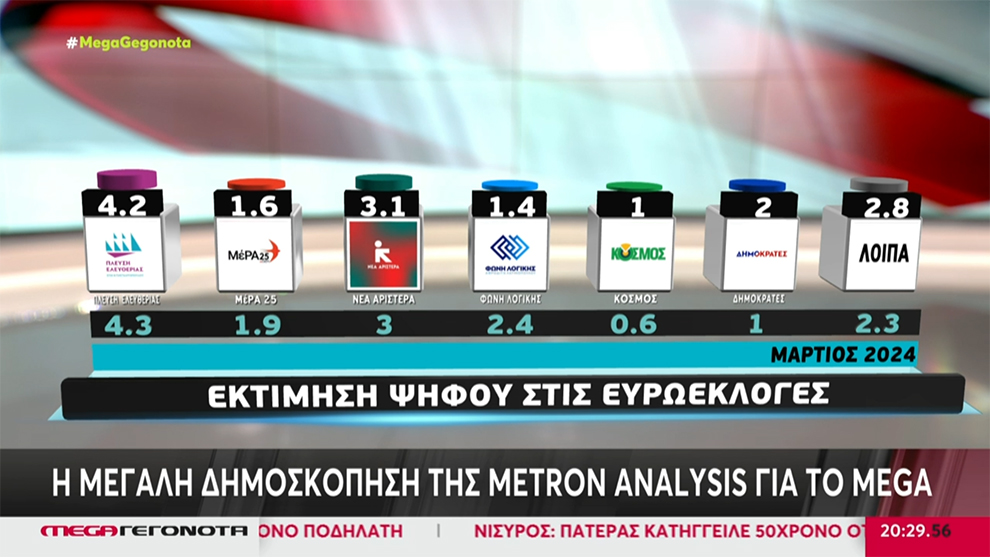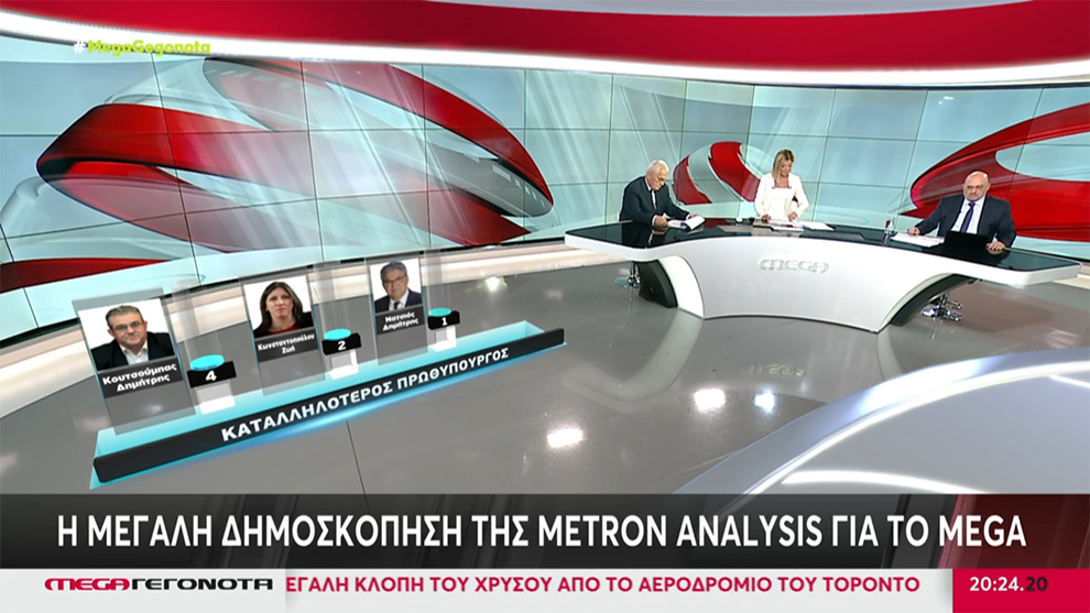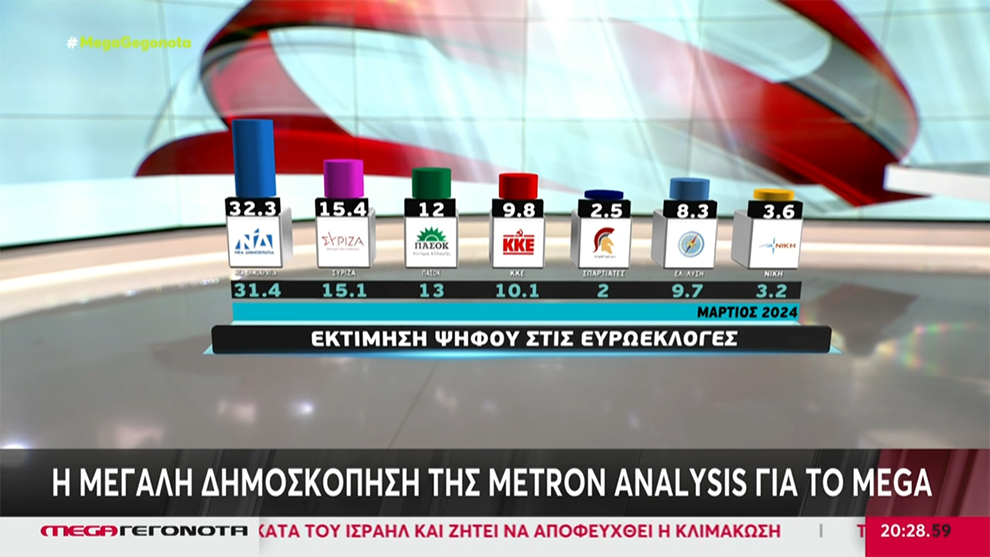 Να πιάνει τον εκλογικό της στόχο εμφανίζεται η Νέα Δημοκρατία σε δημοσκόπηση της Metron Analysis για λογαριασμό του MEGA. Την ίδια ώρα ο ΣΥΡΙΖΑ καταγράφεται να «ανοίγει» την ψαλίδα με το ΠΑΣΟΚ και να εδραιώνεται στη δεύτερη θέση, ενώ το ΚΚΕ μοιάζει να ανατρέπει την κατάσταση με την Ελληνική Λύση και να περνά και πάλι μπροστά.