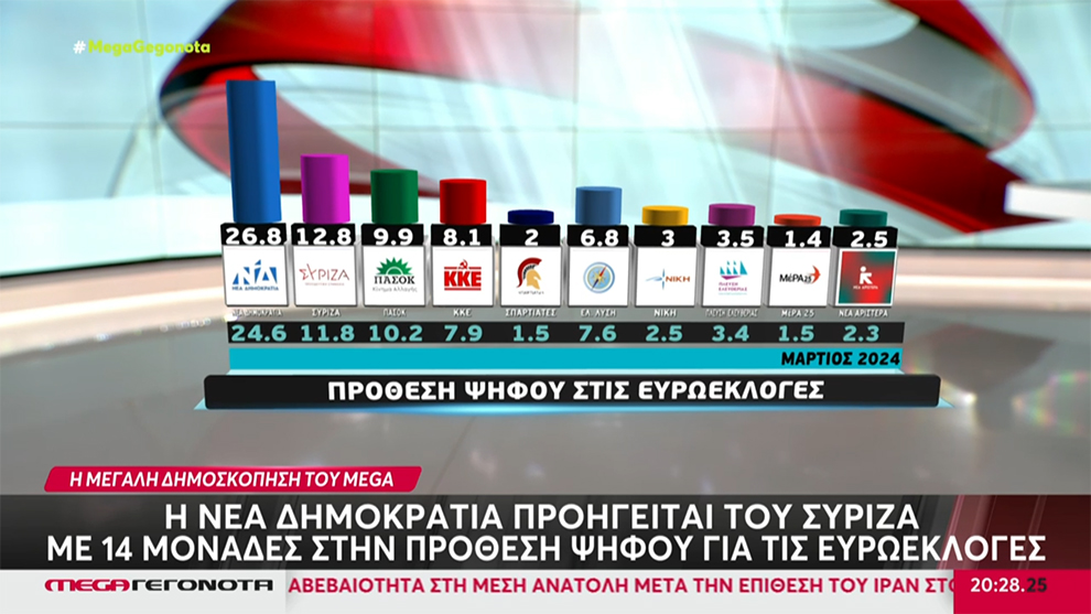 Στην πρόθεση ψήφου της έρευνας η Νέα Δημοκρατία καταγράφεται στο 26,8%, ο ΣΥΡΙΖΑ στο 12,8%, το ΠΑΣΟΚ στο 9,9%, το ΚΚΕ στο 8,1% και η Ελληνική Λύση 6,8%. Η Πλεύση Ελευθερίας βρίσκεται στο 3,5%, η Νίκη στο 3%, η Νέα Αριστερά στο 2,5%, οι Σπαρτιάτες στο 2%, οι Δημοκράτες στο 1,6%, το ΜέΡΑ25 στο 1,4% και η Φωνή Λογικής στο 1,2%.