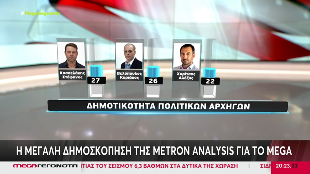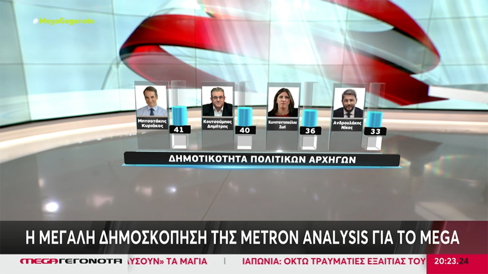 Στις δημοτικότητες των πολιτικών αρχηγών ο Κυριάκος Μητσοτάκης προηγείται με 41% έναντι 40% του Δημήτρη Κουτσούμπα και ακολουθεί η Ζωή Κωνσταντοπούλου με 36% και ο Νίκος Ανδρουλάκης με 33%. Την πρώτη πεντάδα κλείνει ο Στέφανος Κασσελάκης με 27%.