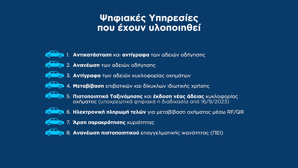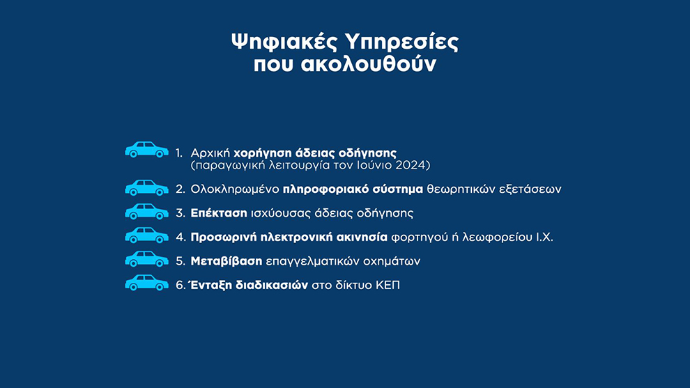 Παράλληλα, από τον Ιούνιο θα τεθεί επίσης σε λειτουργία η αρχική χορήγηση άδειας οδήγησης, ενώ στο άμεσο μέλλον θα ενεργοποιηθούν επιπρόσθετες ψηφιακές υπηρεσίες, όπως το ολοκληρωμένο πληροφοριακό σύστημα θεωρητικών εξετάσεων, η επέκταση ισχύουσας άδειας οδήγησης, η προσωρινή ηλεκτρονική ακινησία φορτηγού ή λεωφορείου Ι.Χ., η μεταβίβαση επαγγελματικών οχημάτων και η ένταξη διαδικασιών στο δίκτυο των Κέντρων Εξυπηρέτησης Πολιτών (ΚΕΠ).