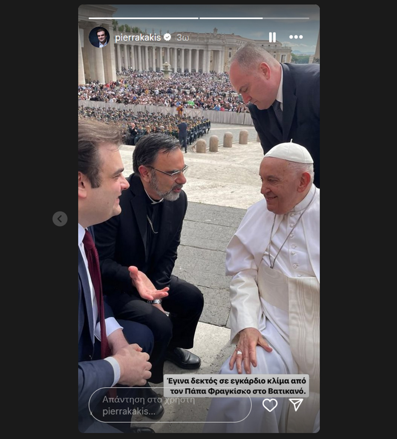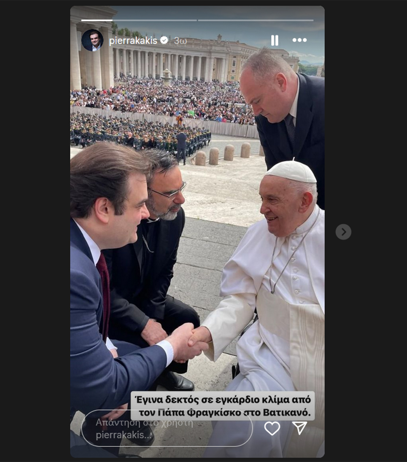Στο Βατικανό βρίσκεται ο υπουργός Παιδείας και Θρησκευμάτων Κυριάκος Πιερρακάκης, ο οποίος έγινε δεκτός σε «εγκάρδιο κλίμα από τον Πάπα Φραγκίσκο», σύμφωνα με ανάρτησή του στα μέσα κοινωνικής δικτύωσης.