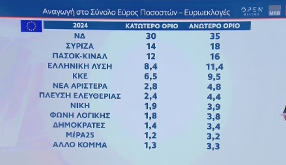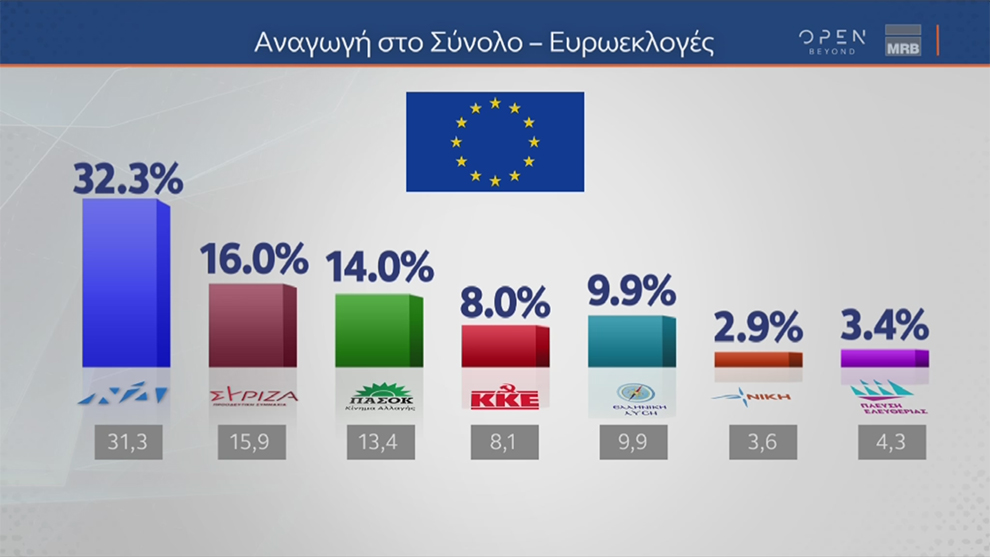 Στην εκτίμηση ψήφου της έρευνας, η Νέα Δημοκρατία βρίσκεται στο 32,3%. Ακολουθεί ο ΣΥΡΙΖΑ με 16% και το ΠΑΣΟΚ στην τρίτη θέση με 14%. Η Ελληνική Λύση «ακουμπά» το διψήφιο ποσοστό, φτάνοντας στο 9,9%. Ακολουθεί το ΚΚΕ με 8%, ενώ σημαντικά έχει αυξηθεί το ποσοστό της Νέας Αριστεράς, που είναι στο 3,8%. Η Πλεύση Ελευθερίας δείχνει να είναι το τελευταίο κόμμα που εξασφαλίζει εκπροσώπηση στην Ευρωβουλή με 3,4%.