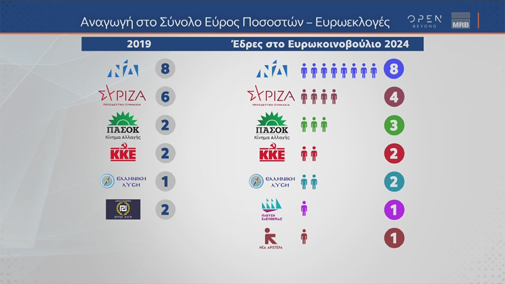 Με τα αποτελέσματα αυτά η Νέα Δημοκρατία εξασφαλίζει 8 έδρες στην Ευρωβουλή, ο ΣΥΡΙΖΑ 4, το ΠΑΣΟΚ 3, το ΚΚΕ 2, όπως και η Ελληνική Λύση. Από έναν ευρωβουλευτή εξασφαλίζουν Πλεύση Ελευθερίας και Νέα Αριστερά.