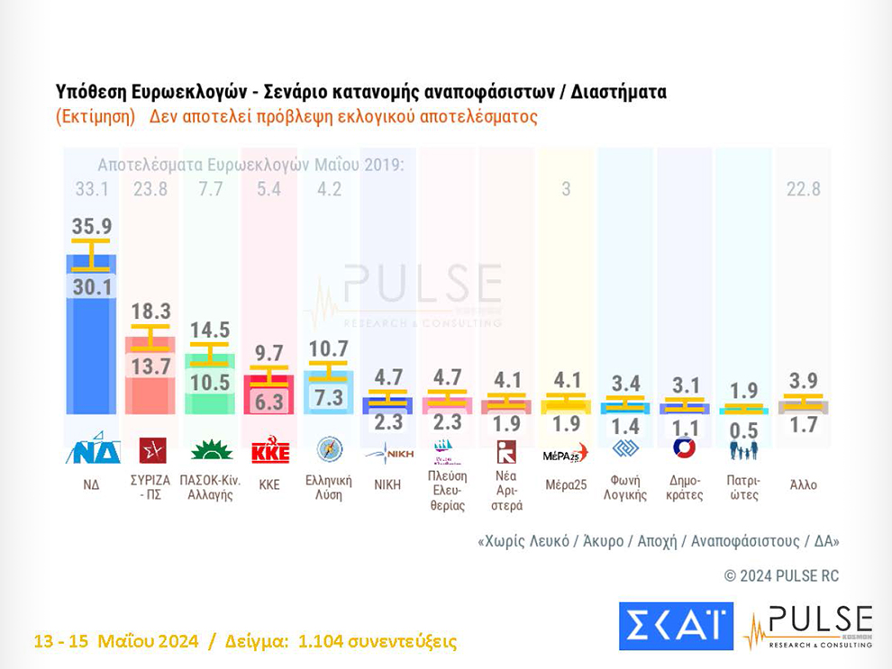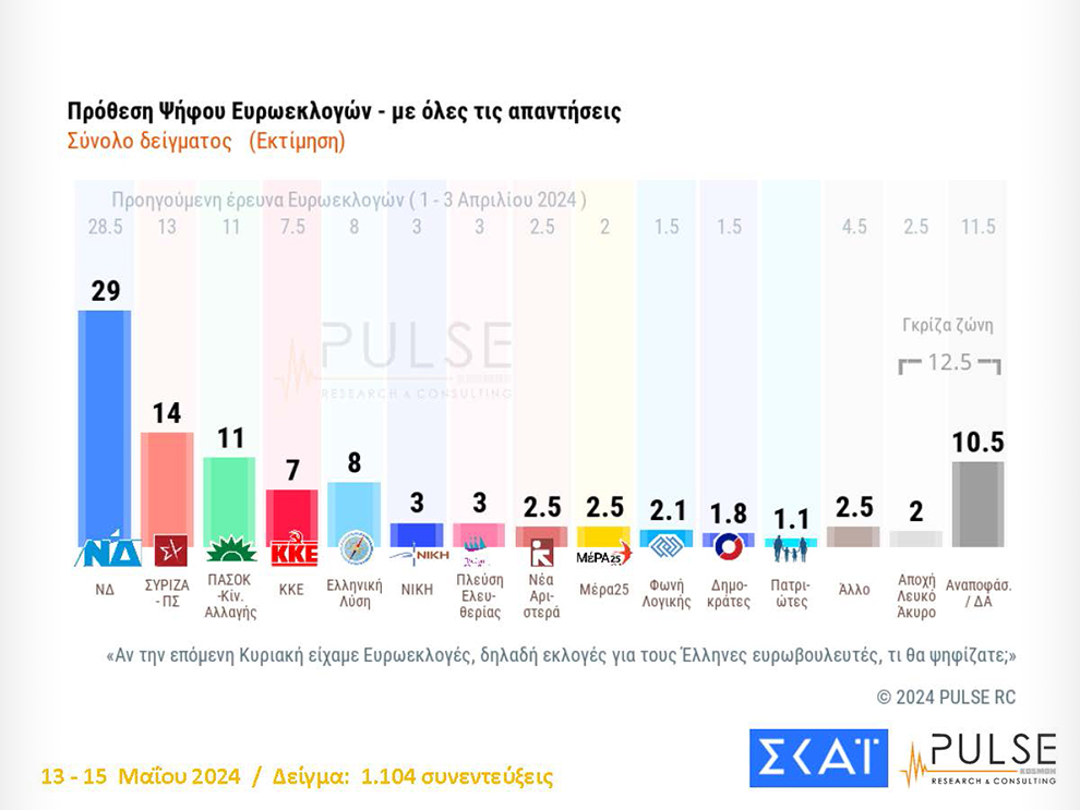 Στην πρόθεση ψήφου των ευρωεκλογών η Νέα Δημοκρατία καταγράφει 29%, ο ΣΥΡΙΖΑ 14%, το ΠΑΣΟΚ 11%, η Ελληνική Λύση 8%, το ΚΚΕ 7%, η Νίκη 3%, η Πλεύση Ελευθερίας 3%, η Νέα Αριστερά 2,5%, το ΜέΡΑ25 2,5%, η Φωνή Λογικής 2,1%, οι Δημοκράτες 1,8%, οι Πατριώτες 1,1%, ενώ η γκρίζα ζώνη φτάνει το 12,5%.