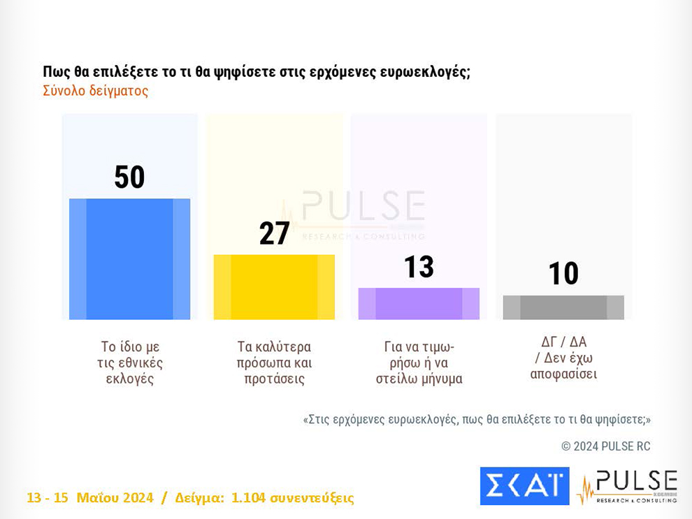 Σε ερώτηση, σε όσους δηλώνουν ότι θα ψηφίσουν, σχετικά με το πώς θα επιλέξουν τι να ψηφίσουν, το 50% απαντά «το ίδιο με τις εθνικές εκλογές», το 27% απαντά «τα καλύτερα πρόσωπα», το 13% «για να τιμωρήσω ή να στείλω μήνυμα» και το 10% «δεν γνωρίζω/δεν απαντώ/δεν έχω αποφασίσει».
