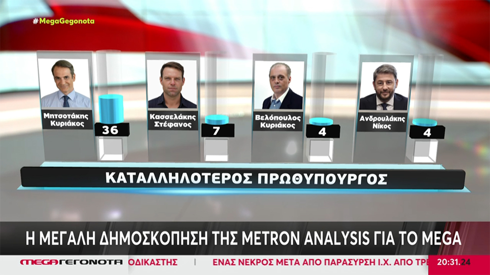 Στο ερώτημα για καταλληλότερο πρωθυπουργό, ο Κυριάκος Μητσοτάκης καταγράφει 36% και ακολουθούν: ο Στέφανος Κασσελάκης με 7%, ο Κυριάκος Βελόπουλος με 4%, ο Νίκος Ανδρουλάκης με 4%, ο Δημήτρης Κουτσούμπας με 3%, η Ζωή Κωνσταντοπούλου με 2%, ο Γιάνης Βαρουφάκης με 2% και ο Αλέξης Χαρίτσης με 1%.