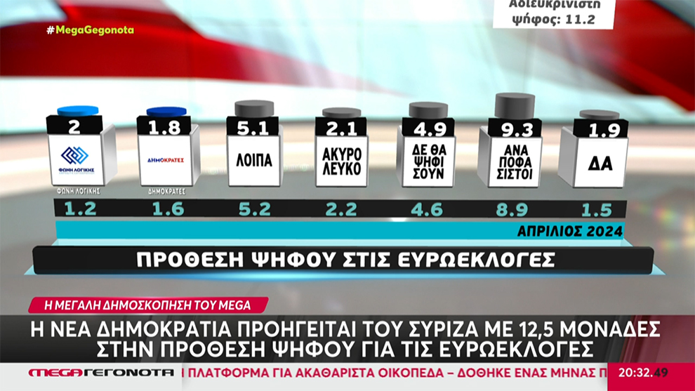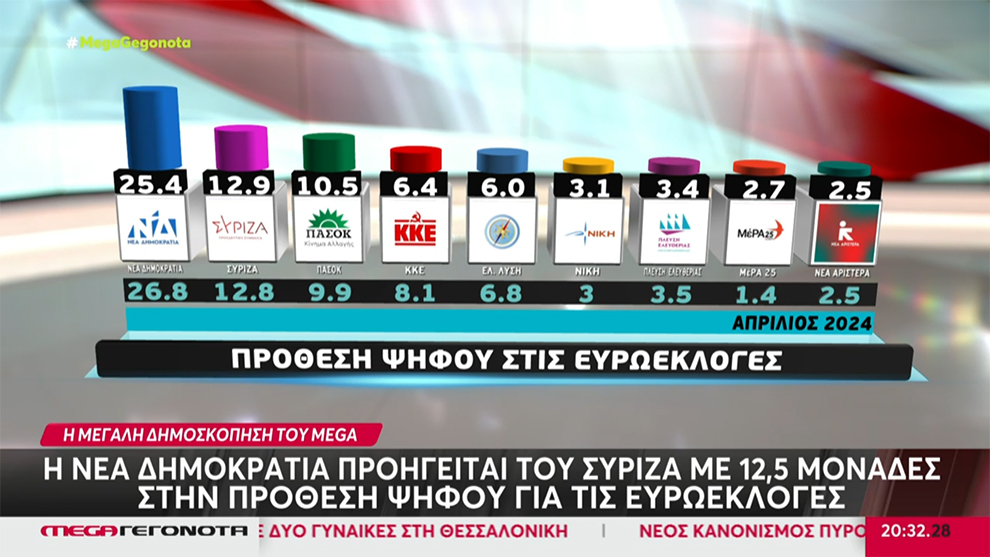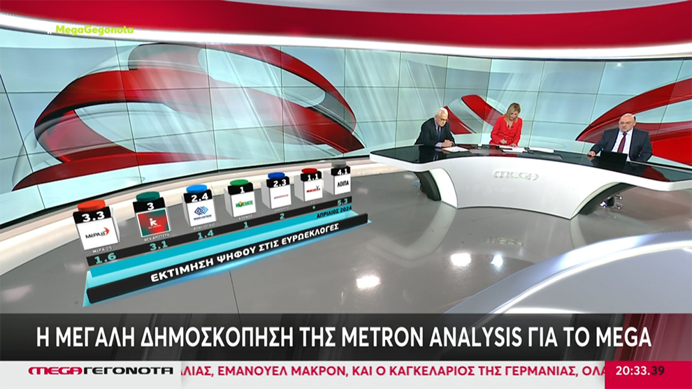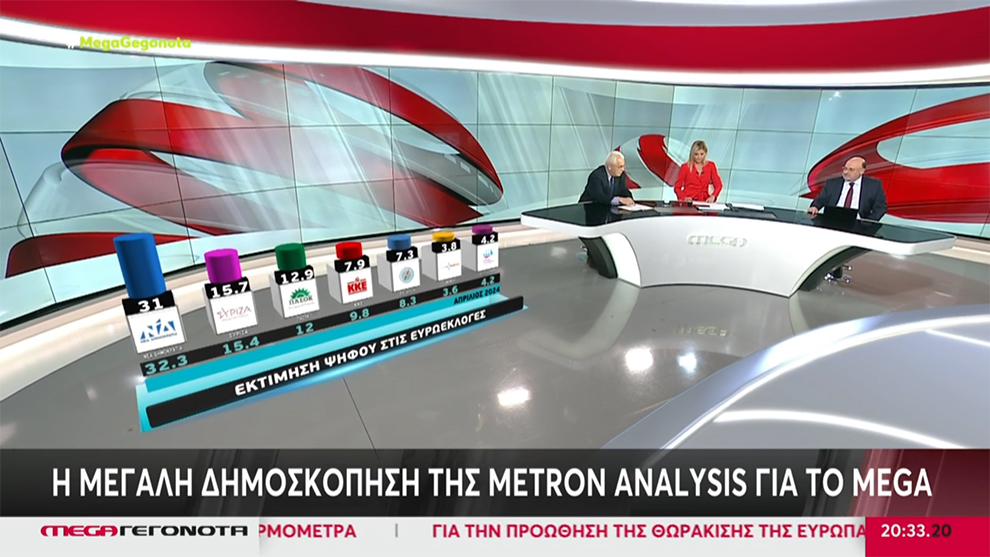 Στις 15,3 μονάδες καταγράφεται η διαφορά του ΣΥΡΙΖΑ από τη Νέα Δημοκρατία στη δημοσκόπηση της Metron Analysis για τις Ευρωεκλογές της 9ης Ιουνίου για λογαριασμό του MEGA. Η Νέα Δημοκρατία βρίσκεται στο 31% με δεύτερο τον ΣΥΡΙΖΑ, ενώ το ΚΚΕ μοιάζει να κερδίζει και πάλι την τέταρτη θέση από την Ελληνική Λύση.