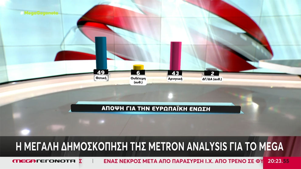 Ερωτηθέντες σχετικά με την άποψή τους για την ΕΕ, οι πολίτες απαντούν σε ποσοστό 49% «θετική» και κατά 43% «αρνητική», ενώ ουδέτερη άποψη έχει το 6%.