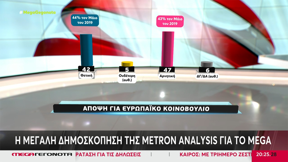 Αντίστροφα εμφανίζονται τα ποσοστά στην αξιολόγηση του Ευρωπαϊκού Κοινοβουλίου. Αρνητική άποψη δηλώνει ότι έχει το 47% και θετική το 42%. Ουδέτερη δηλώνει το 5%.