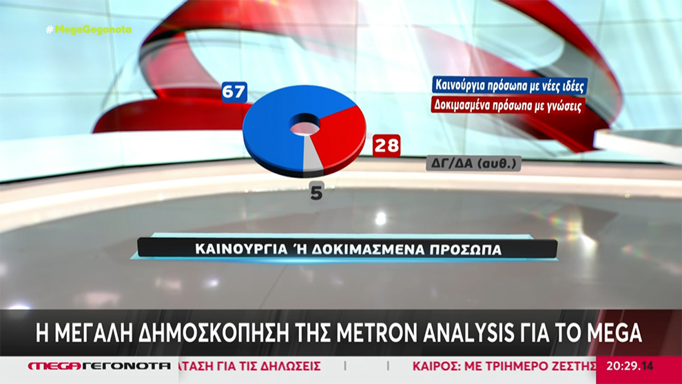 Σχετικά με το αν θέλουν να εκλεγούν καινούργια ή δοκιμασμένα πρόσωπα, το 67% δηλώνει «καινούργια» και το 28% «δοκιμασμένα».