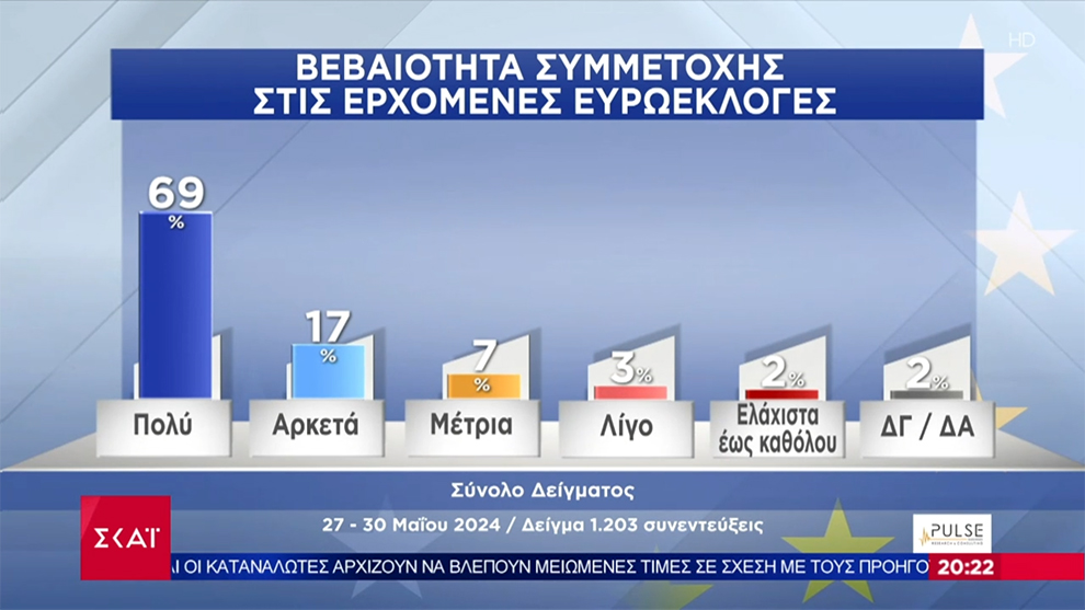 Στο ερώτημα πόσο βέβαιοι είστε για τη συμμετοχή σας στις Ευρωεκλογές, «πολύ» δηλώνει το 69%, «αρκετά» το 17%, «μέτρια» το 7%, «λίγο» το 3%, «ελάχιστα έως καθόλου» το 2%, «δεν γνωρίζω/δεν απαντώ» το 2%.