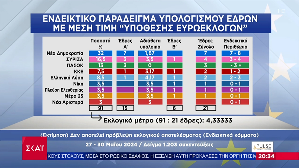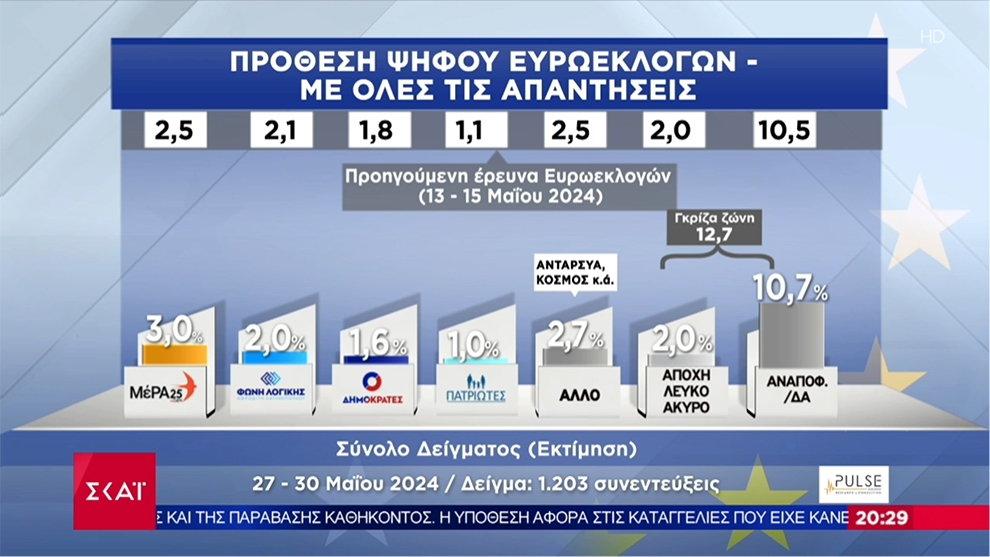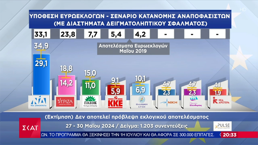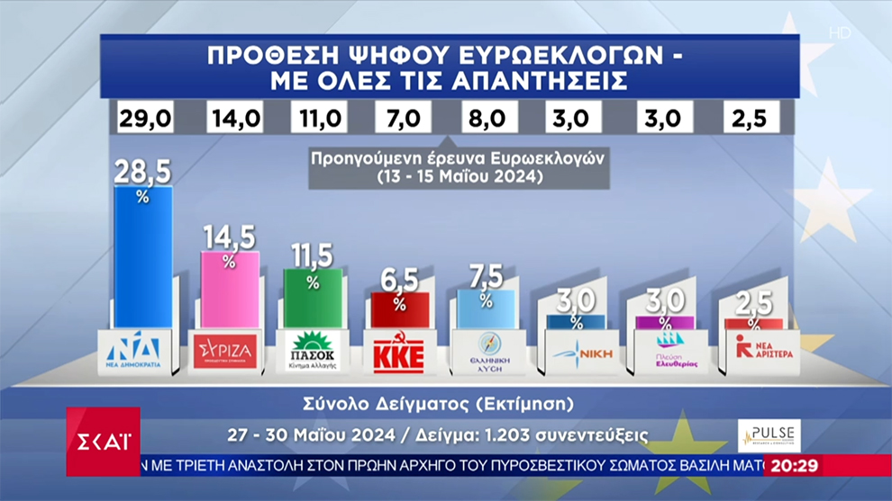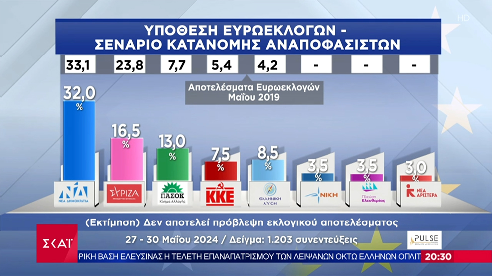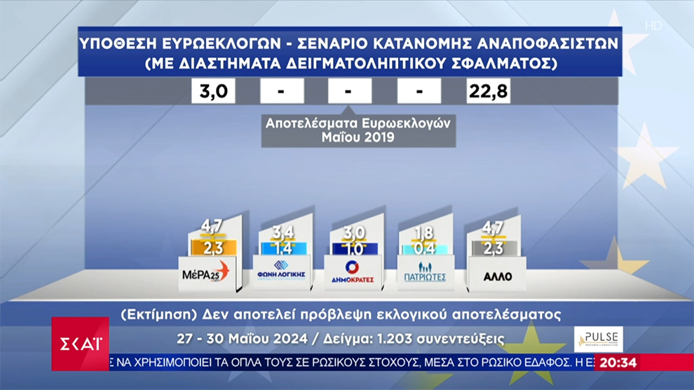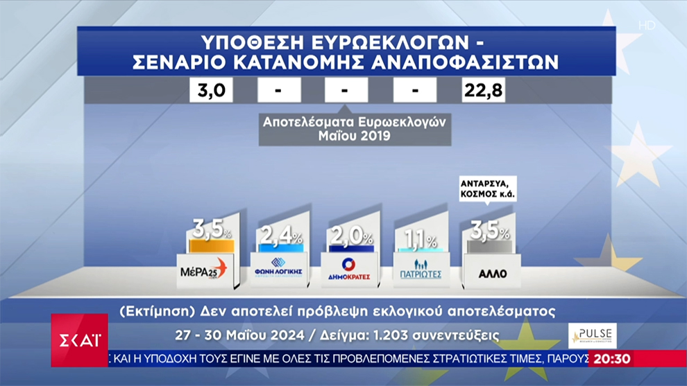 «Καραμπόλες» με τις έδρες των μικρότερων κομμάτων στην Ευρωβουλή προβλέπει δημοσκόπηση της Pulse για λογαριασμό του ΣΚΑΪ, 9 ημέρες πριν από τις Ευρωεκλογές της 9ης Ιουνίου.
