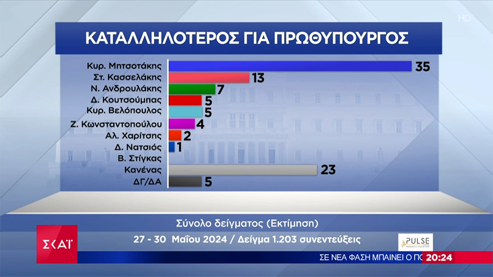 Στον καταλληλότερο για πρωθυπουργό, ο Κυριάκος Μητσοτάκης προηγείται με 35%, ακολουθεί ο Στέφανος Κασσελάκης με 13%, ο Νίκος Ανδρουλάκης με 7%, ο Δημήτρης Κουτσούμπας με 5%, ο Κυριάκος Βελόπουλος με 5%, η Ζωή Κωνσταντοπούλου με 4%, ο Αλέξης Χαρίτσης με 2%, ο Δημήτρης Νατσιός με 1% και «κανένας» με ποσοστό 23%.