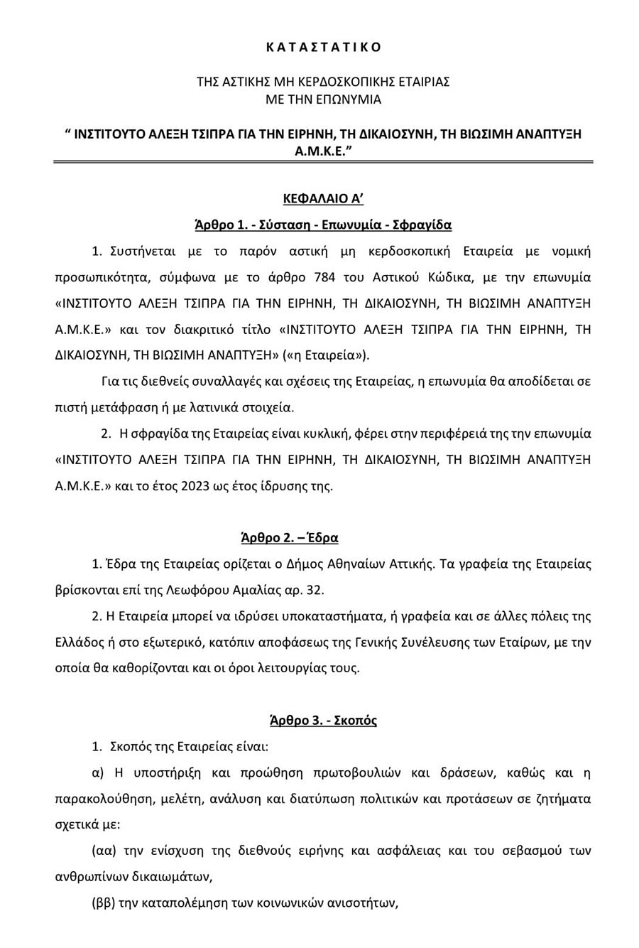 Συγκεκριμένα με αριθμό 173633601000 κατατέθηκε στο ΓΕΜΗ η επωνυμία και το καταστατικό του Ιδρύματος του Αλέξη Τσίπρα, ο οποίος με αυτό το εγχείρημα θα επιχειρήσει το το προσωπικό του rebranding. Στην αστική μη κερδοσκοπική εταιρεία που δημιουργήθηκε, συμμετέχουν, εκτός από πρώην πρωθυπουργό και πρόεδρο του ΣΥΡΙΖΑ, δυο στενοί του συνεργάτες.