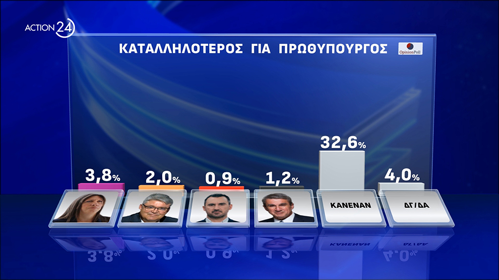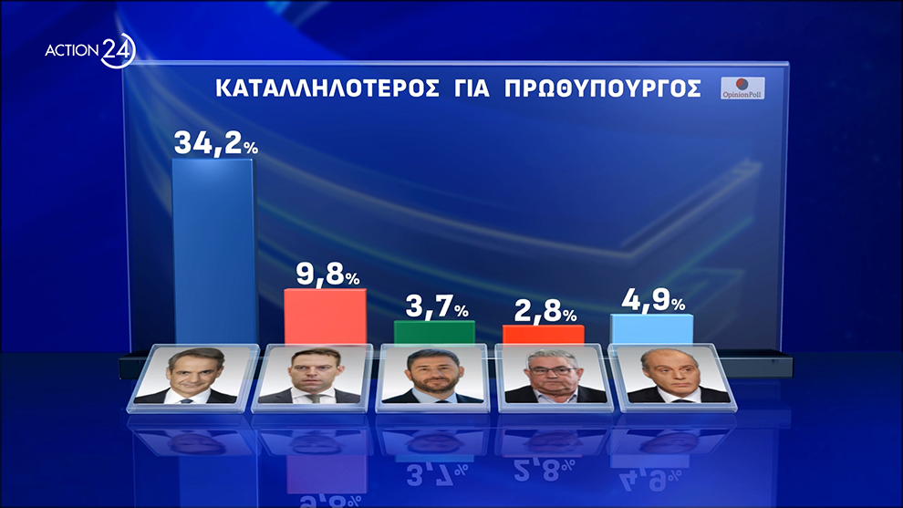 Στην ερώτηση για τον καταλληλότερο πρωθυπουργό, ο Κυριάκος Μητσοτάκης προηγείται με 34,2%, ο Στέφανος Κασσελάκης βρίσκεται στο 9,8%, ο Κυριάκος Βελόπουλος στο 4,9%, η Ζωή Κωνσταντοπούλου στο 3,8%, ο Νίκος Ανδρουλάκης στο 3,7%, ο Δημήτρης Κουτσούμπας στο 2,8%, ο Δημήτρης Νατσιός στο 2%, ο Ανδρέας Λοβέρδος στο 1,2%, ο Αλέξης Χαρίτσης στο 0,9% και η απάντηση «κανένας» στο 32,6%.