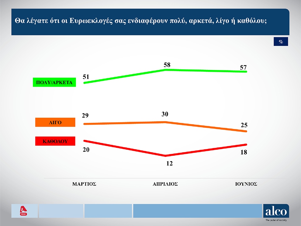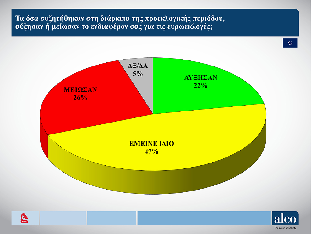 Στην ερώτηση: «πόσο σας ενδιαφέρουν οι ευρωεκλογές» το 57% απαντά «πολύ», το 25% «λίγο» και το 18% «καθόλου». Απαντώντας στο αν όσα συζητήθηκαν στην προεκλογική περίοδο αύξησαν ή μείωσαν το ενδιαφέρον για τις Ευρωεκλογές, το 47% απαντά πως το ενδιαφέρον έμεινε ίδιο, το 22% πως το αύξησαν και το 26% πως το μείωσαν. Σε ερώτηση σχετικά με το αν οι ευρωεκλογές μπορούν να αλλάξουν κάτι στην Ελλάδα, το 60% απαντά «όχι» και το 34% «ναι», ενώ απόλυτα μοιρασμένες είναι οι απαντήσεις στο ερώτημα “αν οι ευρωεκλογές αποτελούν ευκαιρία για ψήφο διαμαρτυρίας“, με το 46% να δηλώνει «ναι» και το 46% να λέει «όχι».