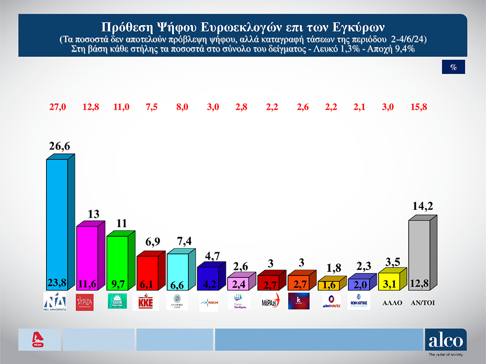 Διαφορά δύο μονάδων και χαμηλό όριο, ψηλότερο από το αντίστοιχο κατώτερο του ΠΑΣΟΚ, παρουσιάζει ο ΣΥΡΙΖΑ σε δημοσκόπηση της «Alco» για λογαριασμό του τηλεοπτικού σταθμού Alpha, πέντε ημέρες πριν από τις Ευρωεκλογές της 9ης Ιουνίου, δείχνοντας να έχει «κλειδώσει» τη 2η θέση.