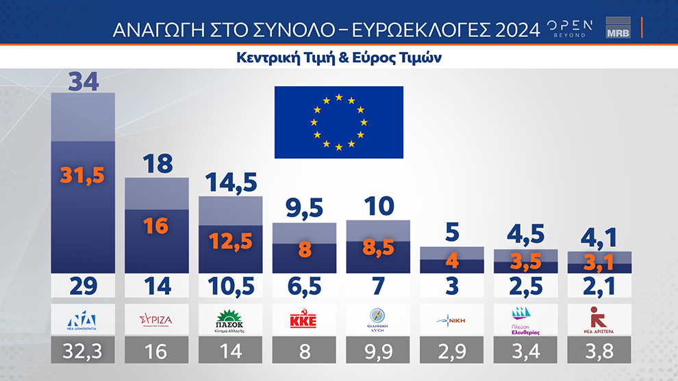 - Νέα Δημοκρατία από 29% έως 34% και μέση τιμή 31,5%,