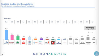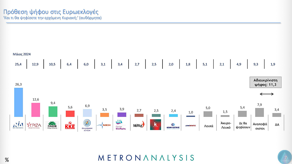 Στην πρόθεση ψήφου, η Νέα Δημοκρατία προηγείται με 26,3%, ο ΣΥΡΙΖΑ με 12,6%, το ΠΑΣΟΚ με 9,4%, η Ελληνική Λύση με 6,9%, το ΚΚΕ με 5,6%, η Πλεύση Ελευθερίας με 3,9%, η Νίκη με 3,5%, η Φωνή Λογικής με 2,4%, οι Δημοκράτες με 1%. Τα «Λοιπά» είναι στο 5%, Άκυρο/Λευκό στο 1,5%, «δεν θα ψηφίσω» δηλώνει το 5,4%, αναποφάσιστο το 7,9% και «δεν απαντώ» το 3,4%.