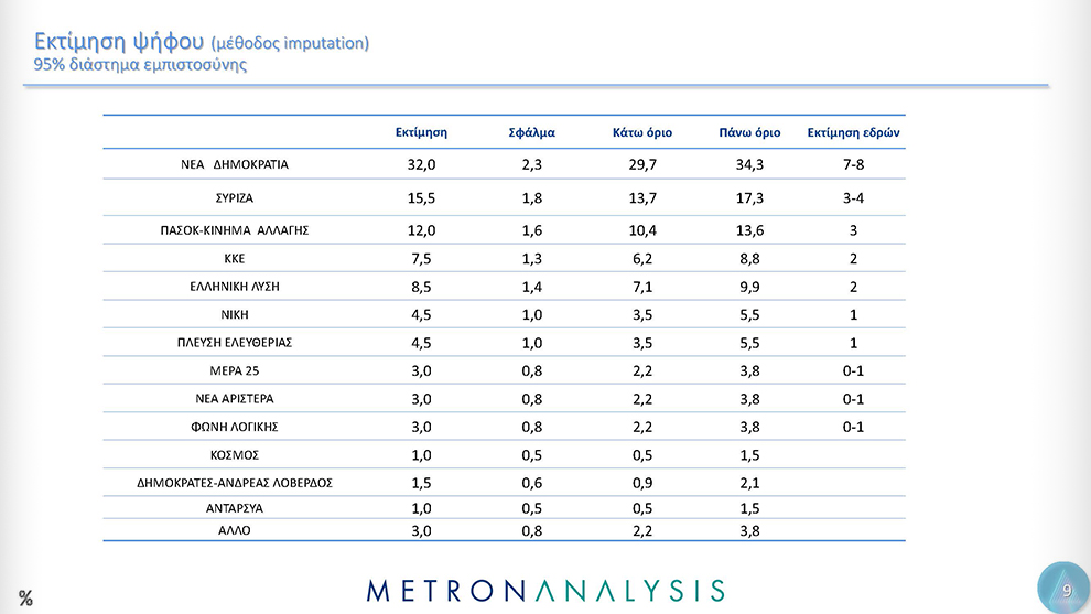 - Ελληνική Λύση από 7,1% έως 9,9% με 2 έδρες
