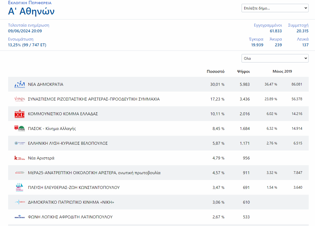 Στην Α’ Αθηνών, με την καταμέτρηση στο 13,25%, η ΝΔ συγκεντρώνει 30,01%, ο ΣΥΡΙΖΑ 17,23 %, το ΚΚΕ 10,11%, το ΠΑΣΟΚ 8,45%.
