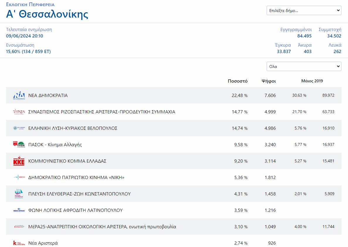 Στην Α΄ Θεσσαλονίκης, με την καταμέτρηση στο 15,6%, η ΝΔ συγκεντρώνει 22,248%, ο ΣΥΡΙΖΑ 14,77%, η Ελληνική Λύση 14,74%, το ΠΑΣΟΚ 9,58% και το ΚΚΕ 9,20%.