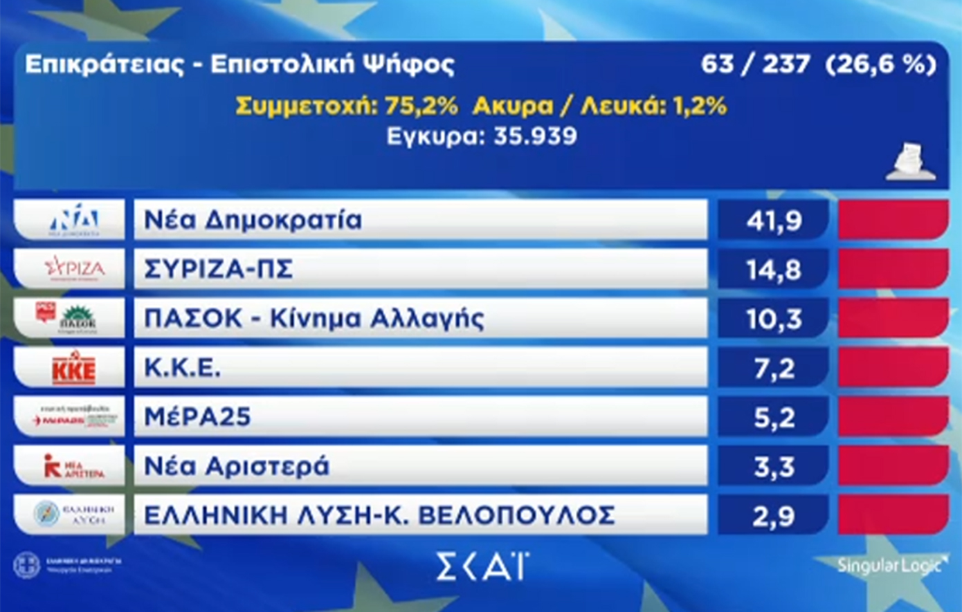 Με την ενσωμάτωση της καταμέτρησης της επιστολικής ψήφου, που για πρώτη φορά εφαρμόστηκε στις Ευρωεκλογές 2024, στο 26,6%, τα αποτελέσματα λίγο μοιάζουν με τα συγκεντρωτικά.