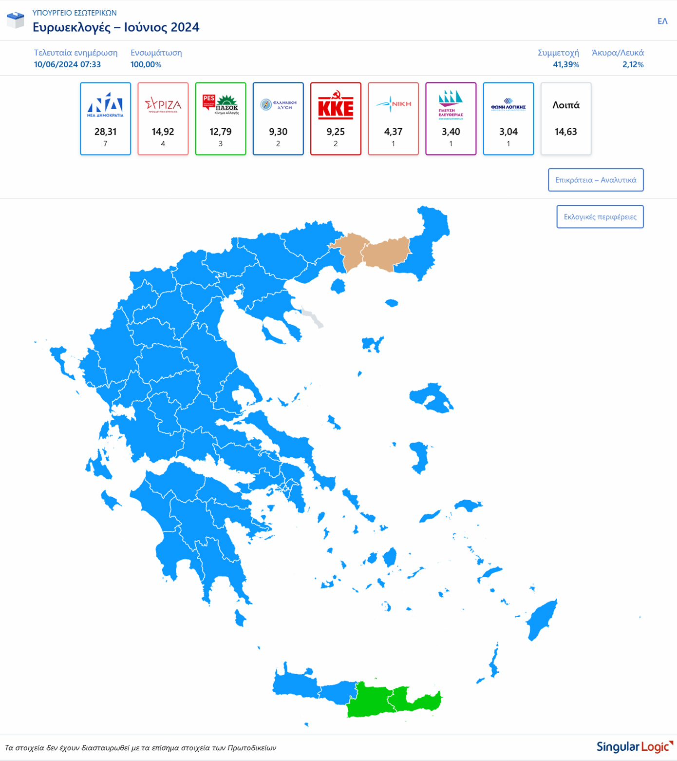 Η καταμέτρηση των ψήφων σε όλη την Ελλάδα έφτασε στο τέλος της μετά τις ευρωεκλογές 2024 και τα ποσοστά των κομμάτων, καθώς και οι έδρες τους στο νέο Ευρωπαϊκό Κοινοβούλιο διαμορφώνονται ως εξής: