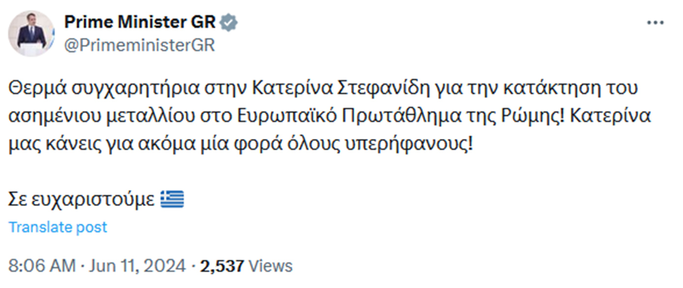 «Θερμά συγχαρητήρια στην Κατερίνα Στεφανίδη για την κατάκτηση του ασημένιου μεταλλίου στο Ευρωπαϊκό Πρωτάθλημα της Ρώμης» έγραψε σε μήνυμά του στο Χ.