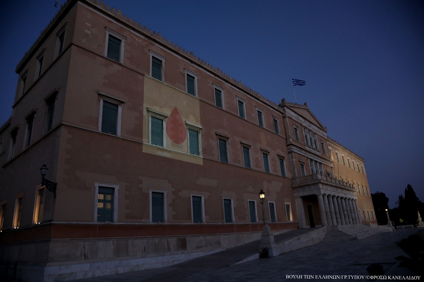 Με αφορμή της Παγκόσμιας Ημέρας του Εθελοντή Αιμοδότη στις 14 Ιουνίου το Μέγαρο του Ελληνικού Κοινοβουλίου φωταγωγήθηκε με κόκκινη σταγόνα.