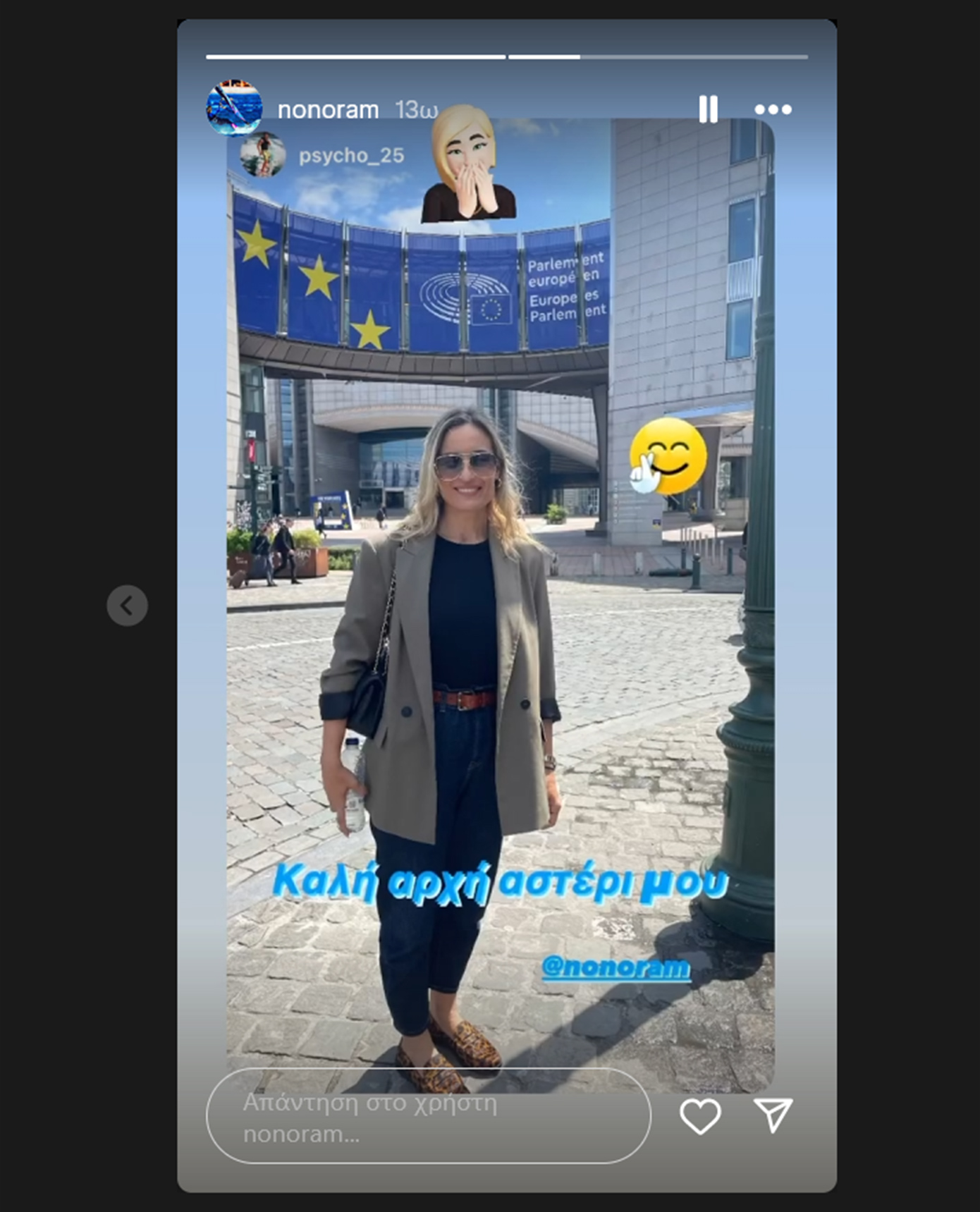 Η παρουσιάστρια βρίσκεται στις Βρυξέλλες λίγες ημέρες μετά την εκλογή της στις Ευρωεκλογές, καθώς εκεί πραγματοποιείται η υποδοχή νέων μελών και αντιπροσωπειών.