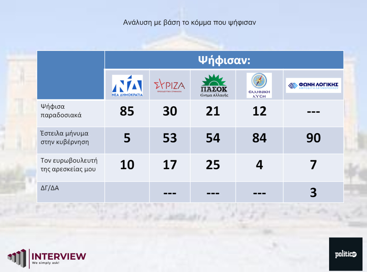 Παράλληλα το 51% απάντησε ότι στις ευρωεκλογές της 9ης Ιουνίου ψήφισε παραδοσιακά το κόμμα που ψηφίζει, το 32% ψήφισε για να στείλει μήνυμα στην κυβέρνηση και το 10% για να ψηφίσει τον ευρωβουλευτή της αρεσκείας του.