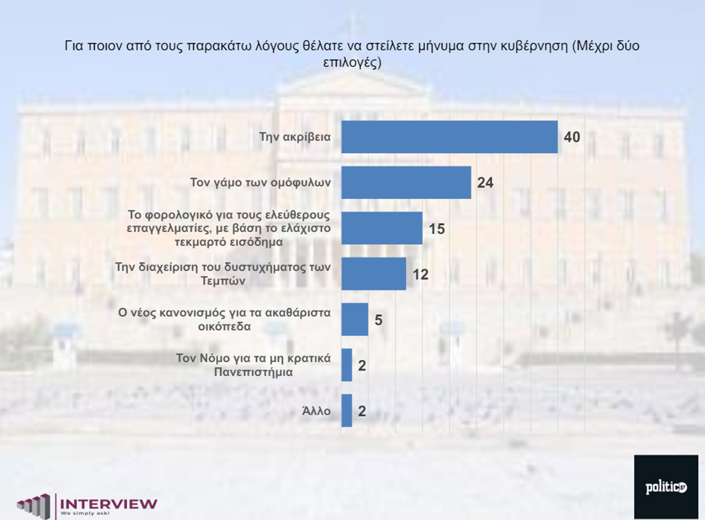 Την ακρίβεια επέλεξαν οι περισσότεροι από όσους συμμετείχαν σε δημοσκόπηση της Interview για το politic.gr, ως την απάντηση στο ερώτημα για ποιον από τους λόγους θέλατε να στείλετε μήνυμα στην κυβέρνηση.