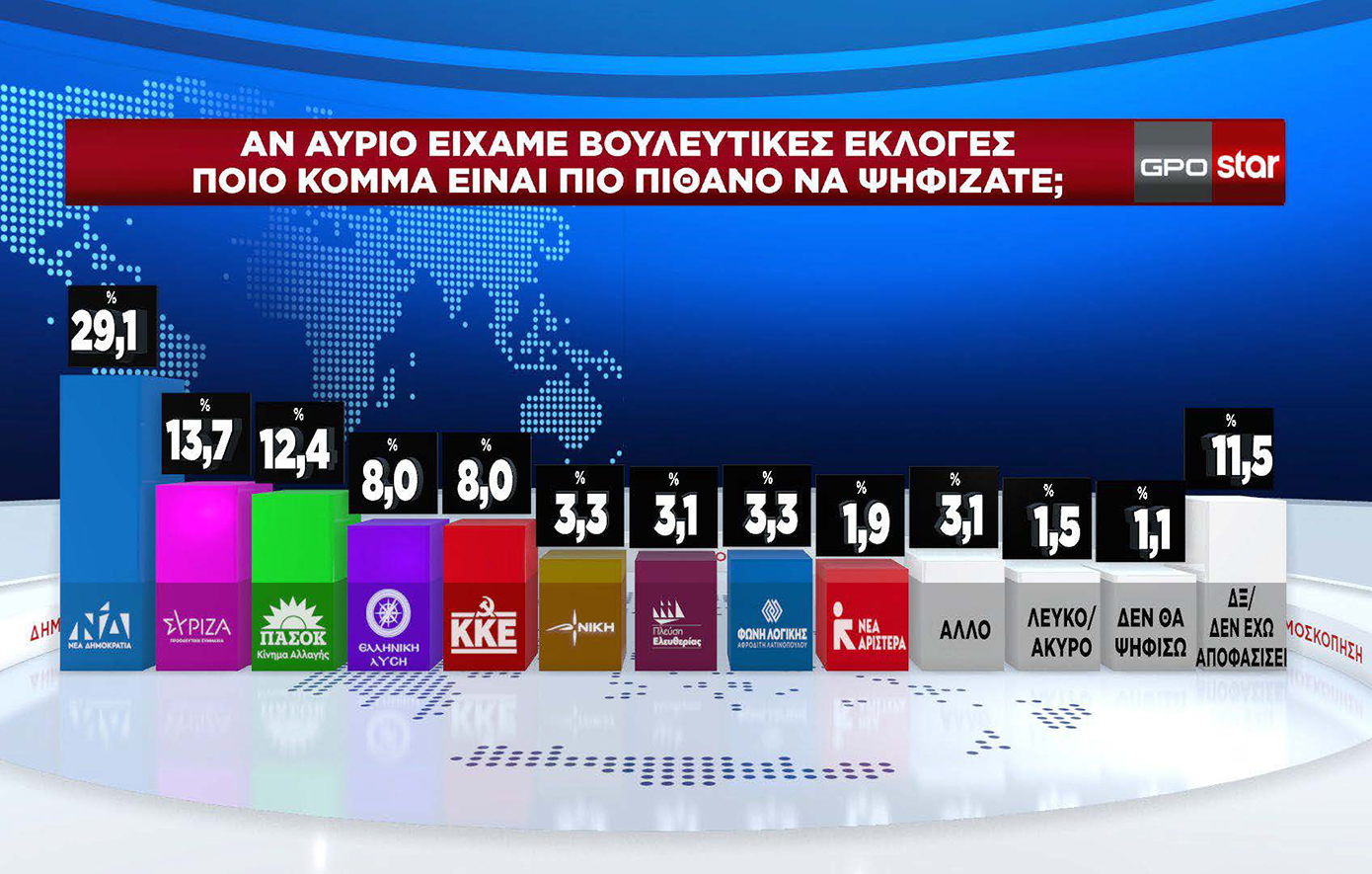 Στην πρόθεση ψήφου για τις βουλευτικές εκλογές, στην πρώτη μέτρηση μετά τις Ευρωεκλογές, η Νέα Δημοκρατία προηγείται με 29,1% και ακολουθεί ο ΣΥΡΙΖΑ με 13,7%. Το ΠΑΣΟΚ βρίσκεται στο 12,4% και ακολουθούν το ΚΚΕ και η Ελληνική Λύση με 8%. Στο 3,3% καταγράφονται Νίκη και Φωνή Λογικής και στο 3,1% η Πλεύση Ελευθερίας.