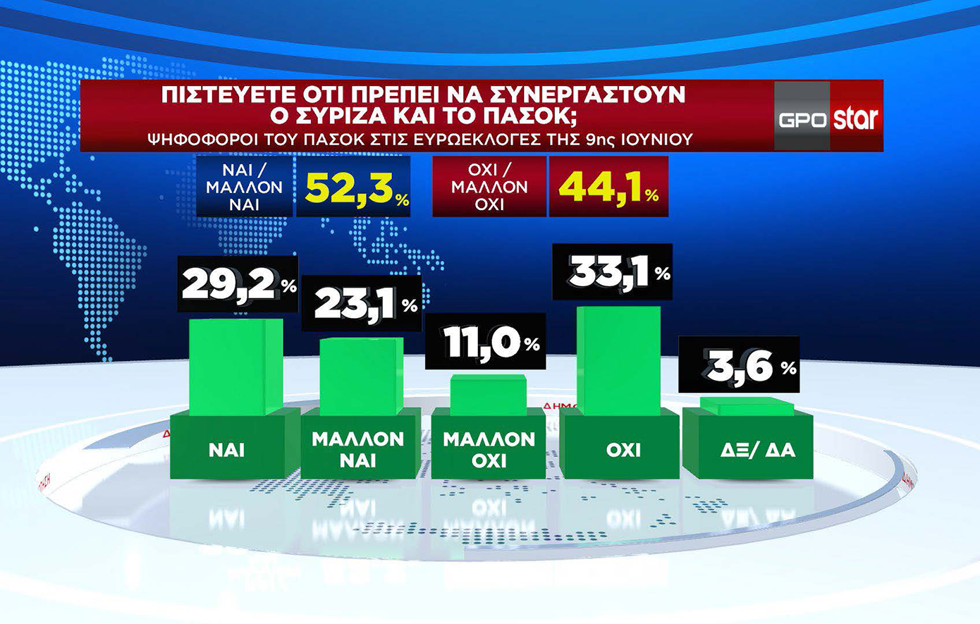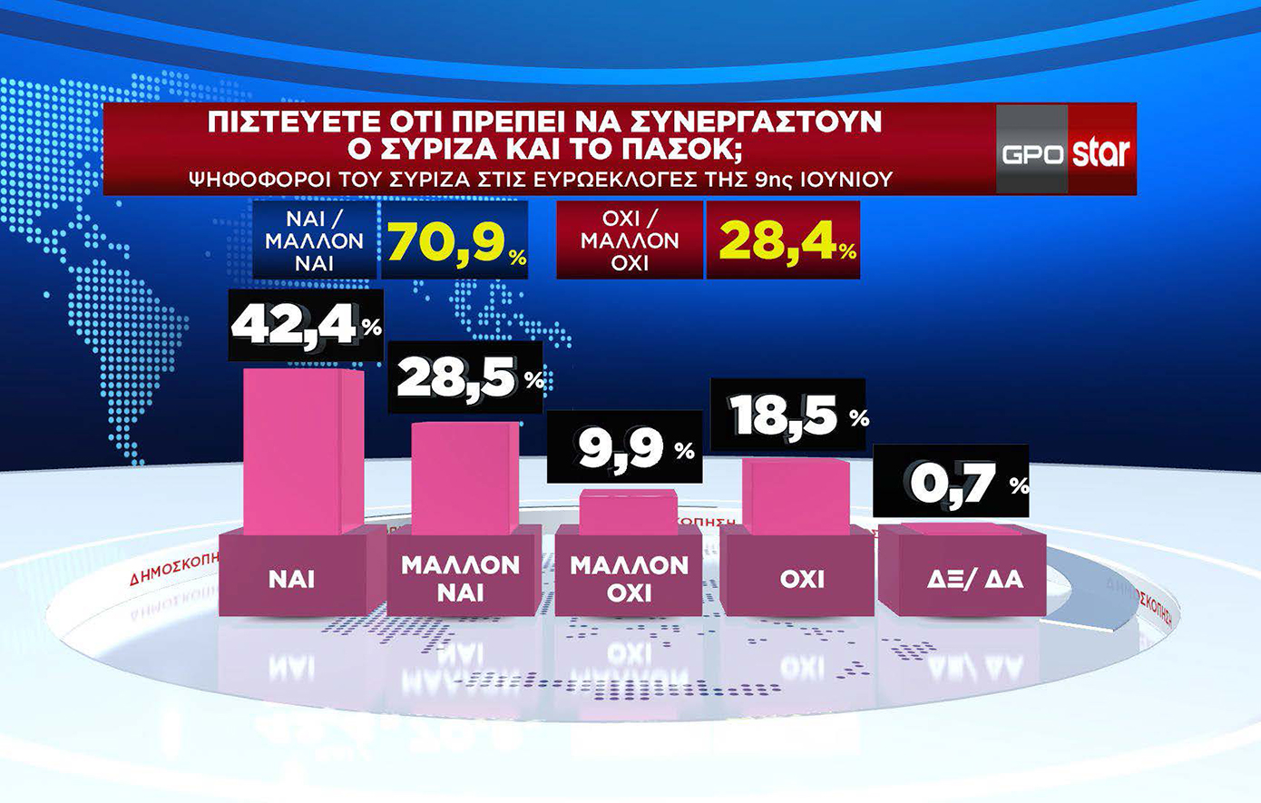 «Ναι» στη συνεργασία του ΣΥΡΙΖΑ και του ΠΑΣΟΚ λένε οι ψηφοφόροι και των δύο κομμάτων, σύμφωνα με δημοσκόπηση της «GPO» για λογαριασμό του «Star».