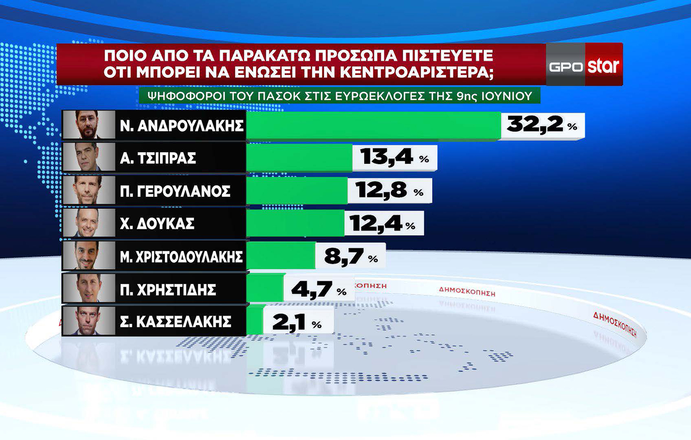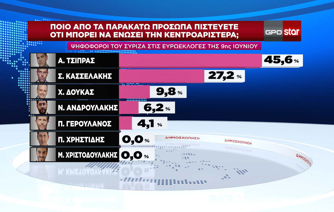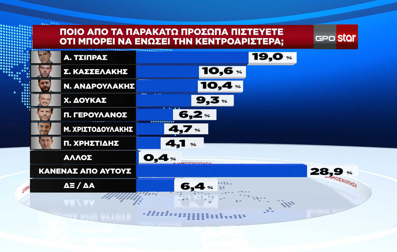 Στο ερώτημα “ποιος μπορεί να ενώσει την Κεντροαριστερά”, ο Αλέξης Τσίπρας, αν και έχει αποσυρθεί από το προσκήνιο, είναι η πρώτη επιλογή και ακολουθούν οι αρχηγοί των κομμάτων: Στέφανος Κασσελάκης και Νίκος Ανδρουλάκης.
