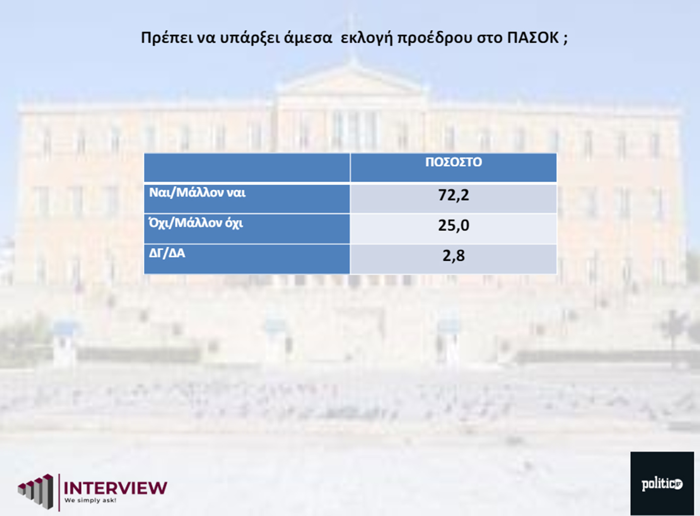 Δημοσκόπηση πραγματοποίησε η Interview για λογαριασμό της POLITIC, σχετικά με την ανάδειξη της νέας ηγεσίας στο ΠΑΣΟΚ.