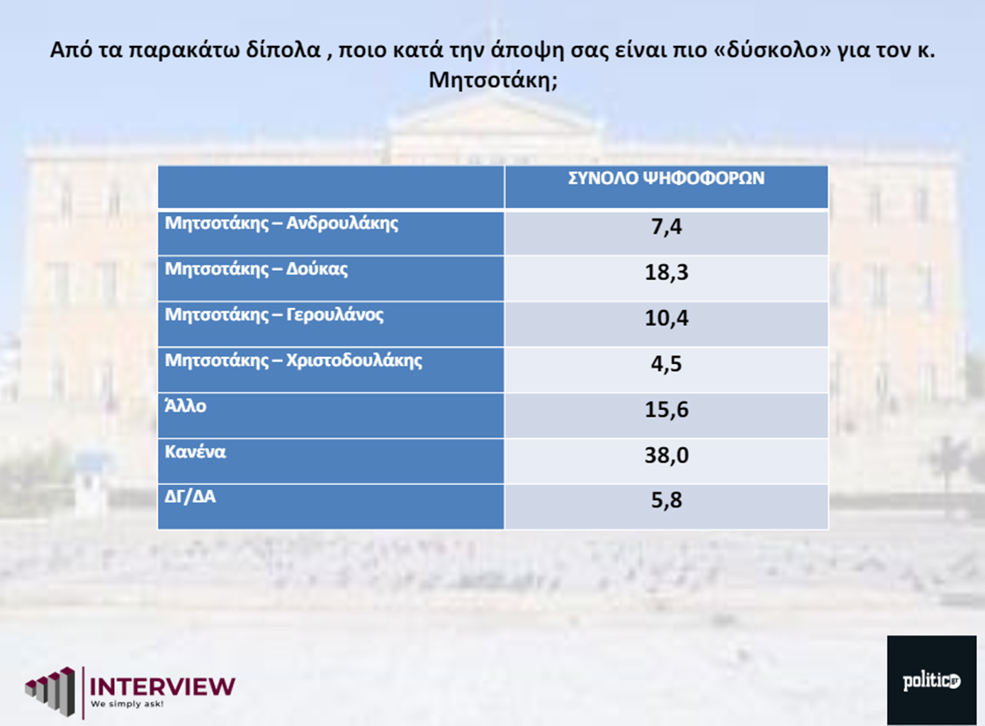 Οι περισσότεροι (38%) απάντησαν ότι «κανείς» από τους υποψήφιους δε μπορεί να ανατρέψει την κυβερνητική σταθερότητα, ενώ μεταξύ των διπόλων, το «Μητσοτάκης – Δούκας» είναι το πιο υπολογίσιμο (18,3%) με αρκετό «αέρα» σε σύγκριση με τους άλλους υποψήφιους του ΠΑΣΟΚ.