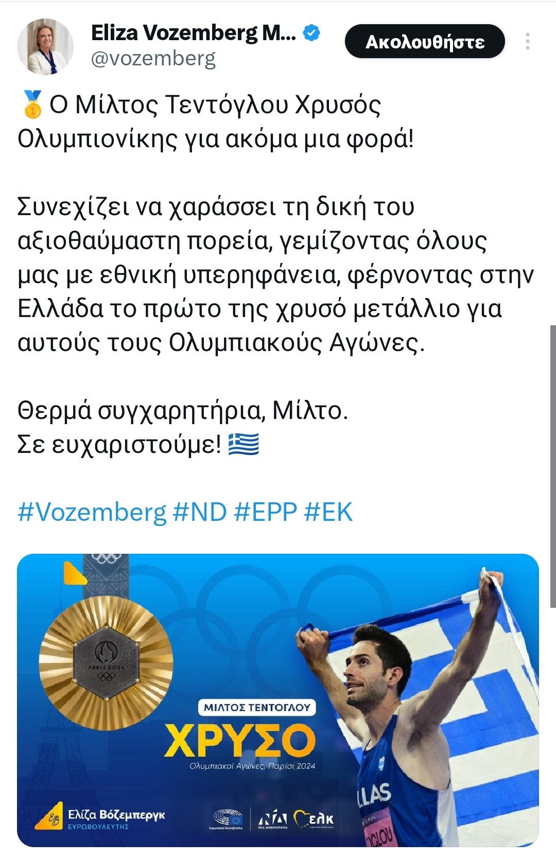 Η ευρωβουλεύτρια της Νέας Δημοκρατίας, Ελίζα Βόζεμπεργκ έχει προκαλέσει αντιδράσεις στα social media με ανάρτησή της στην οποία χρησιμοποιεί την επιτυχία του Μίλτου Τεντόγλου με το χρυσό μετάλλιο στο Παρίσι για τους Ολυμπιακούς Αγώνες, φτιάχνοντας μια κάρτα που περιλάμβανε τη φωτογραφία του αθλητή, συνοδευόμενη με το όνομά της και διαφημίζοντας τη Νέα Δημοκρατία και το Ευρωπαϊκό Λαϊκό Κόμμα.