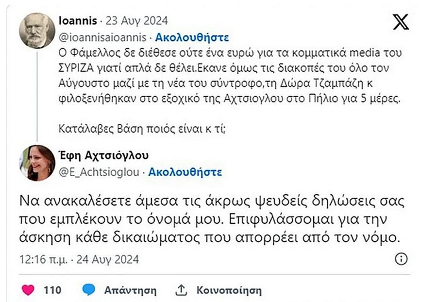 Στη Δικαιοσύνη ανακοίνωσαν ότι θα προσφύγουν ο Σωκράτης Φάμελλος και η Δώρα Τσαμπάζη, με εξαιτίας μιας ανάρτησης στο Χ που έγραφε ότι έχουν σχέση και έκαναν καλοκαιρινές διακοπές στο εξοχικό της Έφης Αχτσιόγλου.