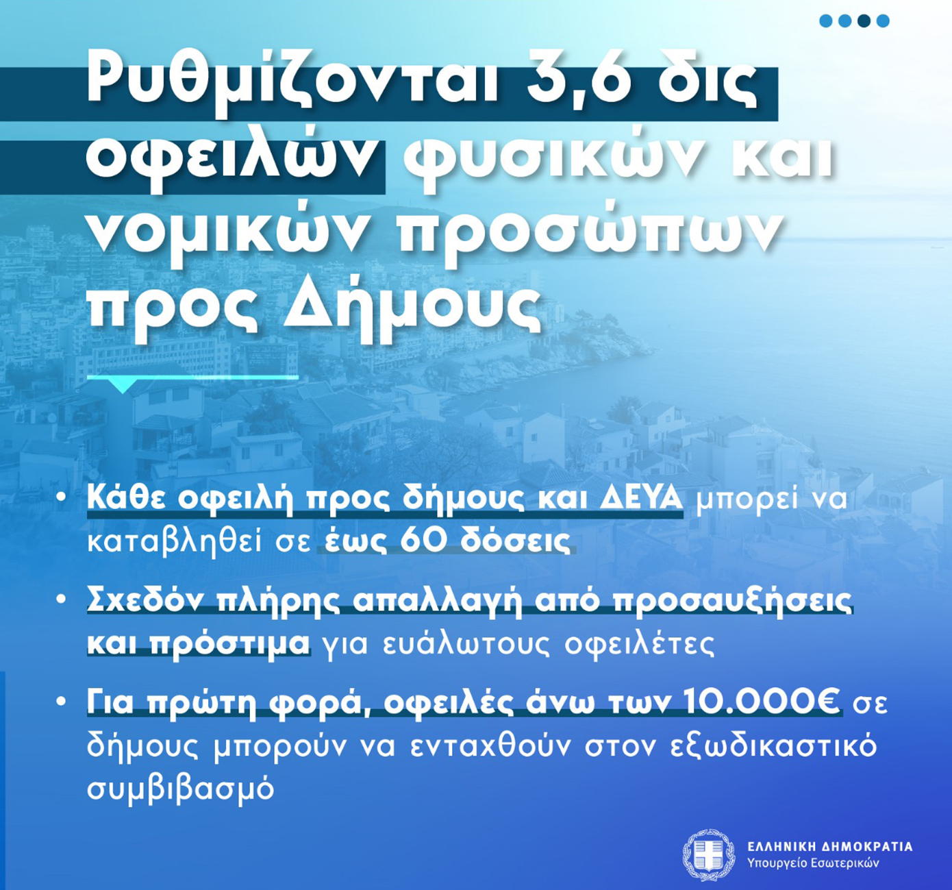 Εισάγεται η δυνατότητα ρύθμισης οφειλών προς τους Δήμους και τα νομικά τους πρόσωπα με καταβολή σε έως 60 δόσεις, για οφειλές που βεβαιώθηκαν ως 31 Αυγούστου 2024. Ειδικά για τους ευάλωτους οφειλέτες, θεσπίζεται, επιπλέον, απαλλαγή από τις προσαυξήσεις έως και 95%. Στόχος της ρύθμισης είναι, αφενός η διευκόλυνση των οφειλετών που θα την αξιοποιήσουν, λαμβάνοντας με τον τρόπο αυτό φορολογική ενημερότητα, και, αφετέρου, η βελτίωση της εισπραξιμότητας των Δήμων, καθώς το ύψος των οφειλών προς τους Δήμους και τις ΔΕΥΑ αγγίζει σήμερα τα 3,6 δισ. ευρώ.