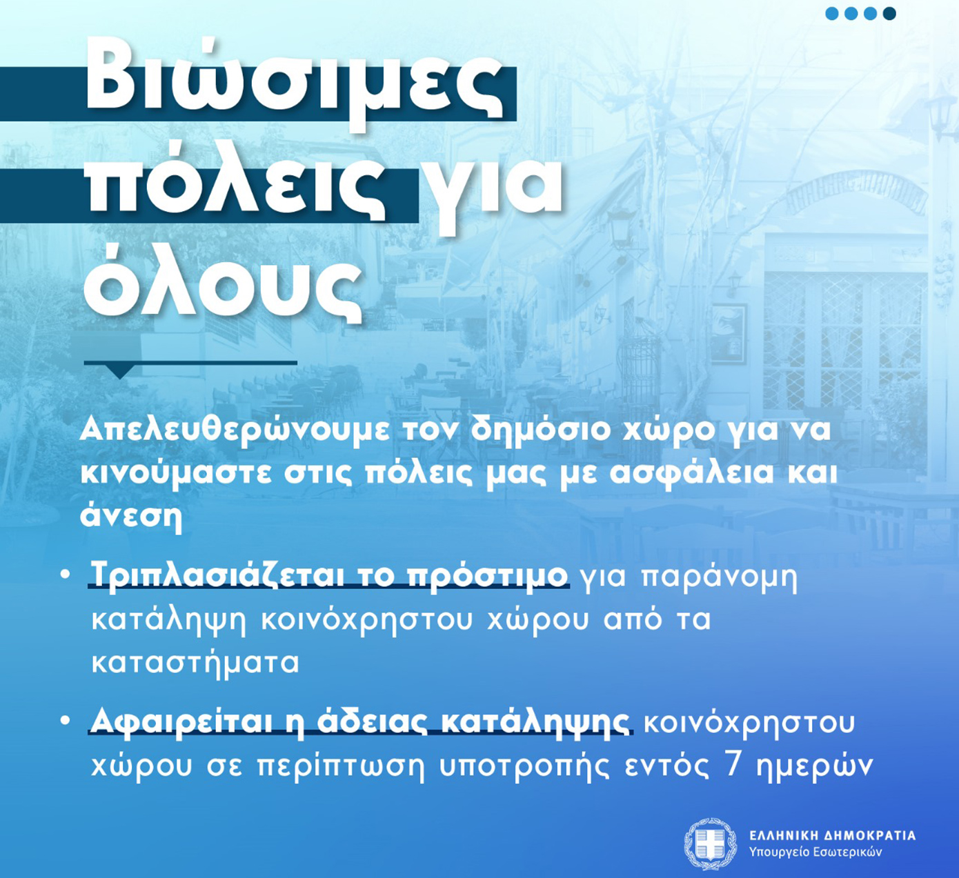 Τριπλασιάζεται το πρόστιμο για την αυθαίρετη χρήση κοινόχρηστων χώρων και αυστηροποιούνται οι κυρώσεις από τη μη συμμόρφωση των παραβατών στην άρση της παράνομης κατάληψης, προκειμένου να διευκολυνθεί η απελευθέρωση του δημόσιου χώρου και η απρόσκοπτη διέλευση των πεζών.