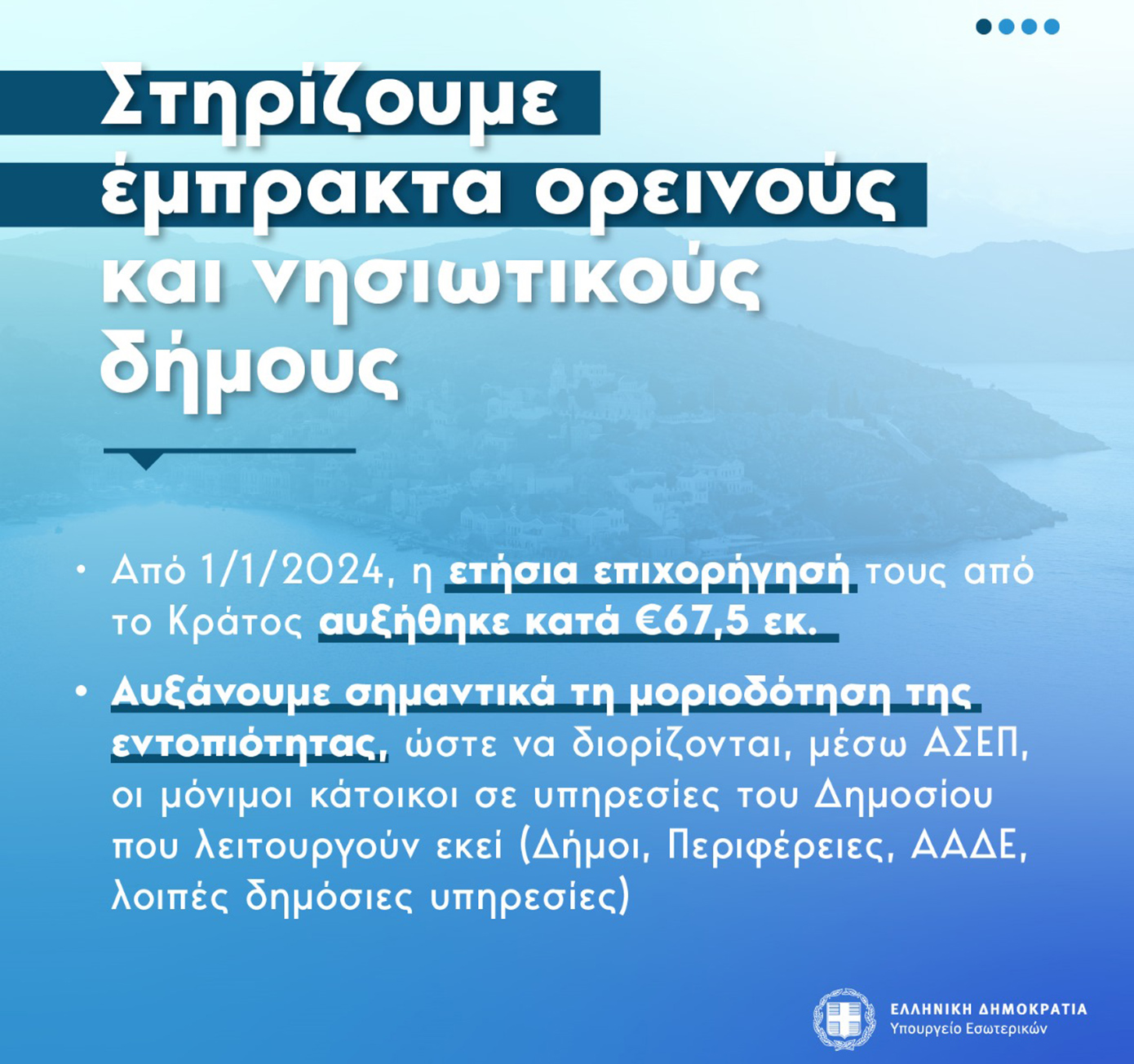 Το Σύνταγμα της Ελλάδας επιβάλλει στην Πολιτεία να λάβει κάθε αναγκαίο μέτρο για την ενίσχυση των ορεινών και νησιωτικών Δήμων. Σήμερα, η μείωση του πληθυσμού των ορεινών και νησιωτικών δήμων, σε συνδυασμό με την έλλειψη στέγης και το υψηλό κόστος αυτής, έχουν οδηγήσει στην υποστελέχωση των δημόσιων υπηρεσιών στις περιοχές αυτές. Το πρόβλημα καθίσταται ακόμη εντονότερο, καθώς πολλοί από τους υποψηφίους που διορίζονται στις θέσεις αυτές, εντέλει δεν αποδέχονται τον διορισμό τους ή παραιτούνται.