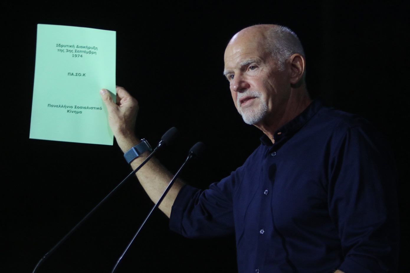 Δυνάμεις προοδευτικές, εντός και εκτός του κόμματος μας, σε μια νέα επαναστατική και απελευθερωτική διαδικασία. Σε μια νέα εγερτήρια διαδικασία, ειρηνικής πράσινης επανάστασης, ενότητας δυναμικής, ανοίγοντας προοπτικές για τις προοδευτικές δυνάμεις και την Ελλάδα», τόνισε ο Γιώργος Παπανδρέου , πρώην Πρωθυπουργός και πρώην πρόεδρος του ΠΑΣΟΚ, στο χαιρετισμό του στη επέτειο των 50 χρόνων της 3ης Σεπτέμβρη , απόψε στο Ζάππειο.