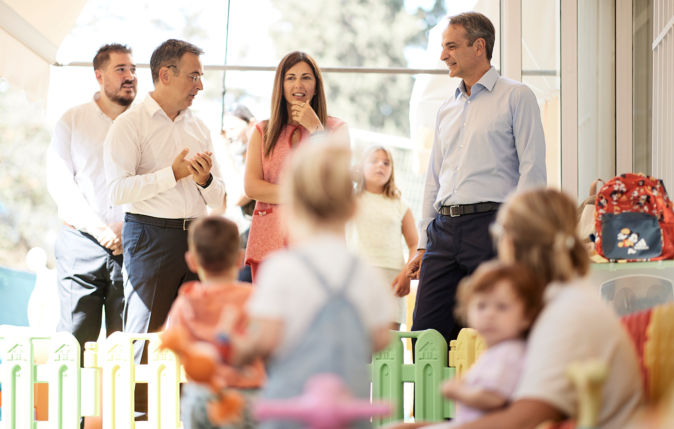 Ο πρωθυπουργός, συνοδευόμενος από την υπουργό Κοινωνικής Συνοχής και Οικογένειας Σοφία Ζαχαράκη, ξεναγήθηκε στους χώρους του βρεφονηπιακού σταθμού και είχε την ευκαιρία να συνομιλήσει με τα παιδιά και τους εργαζόμενους του σταθμού.