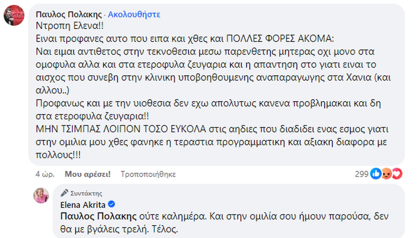 Παύλος Πολάκης και Έλενα Ακρίτα συνεχίζουν τον καβγά τους μετά την αναφορά του πρώτου σχετικά με την τεκνοθεσία, ανταλλάσσοντας σχόλια στο Facebook. Ειδικότερα, κάτω από την πρώτη ανάρτηση της Έλενας Ακρίτα, ο Παύλος Πολάκης έγραψε «ντροπή Έλενα», λέγοντας: