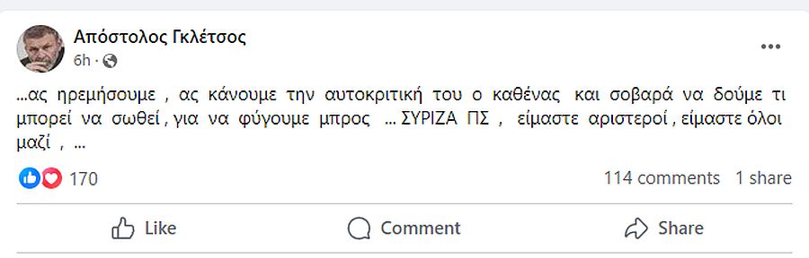 Με ανάρτησή του στα social media ο Απόστολος Γκλέτσος δήλωσε «παρών» στην εκλογική διαδικασία για τον νέο πρόεδρο του ΣΥΡΙΖΑ.